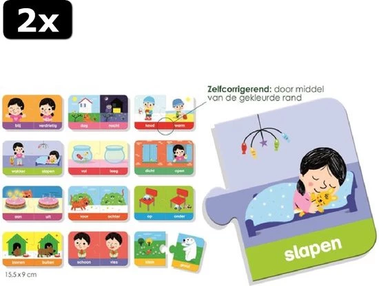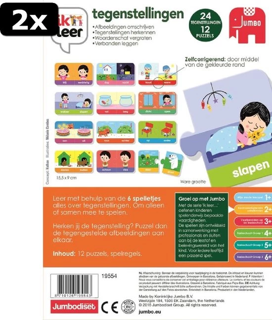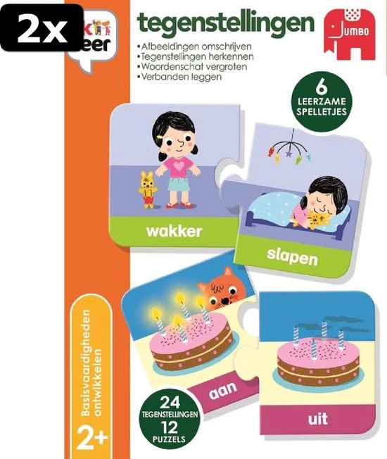 Met ‘Ik leer tegenstellingen’ leren kinderen spelenderwijs afbeeldingen omschrijven, tegenstellingen herkennen, de woordenschat vergroten en verbanden leggen. Als een kind 2 jaar oud is, begint het zijn taal te ontwikkelen. ‘Ik leer tegenstellingen’ speelt hierop in met zes spelletjes, om alleen of samen mee te spelen.