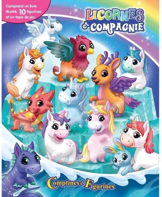 LICORNES ET COMPAGNIE COMPTINES ET FIGURINES – 10 pagina’s hardcover boek, 10 figuren en een speelmat