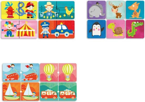 | Verpakkingsinhoud | Een, beroepen, puzzel, (24, stuks), dieren, memory, (30, stuks), en, domino, met, vervoersmiddelen, (36, stuks) |