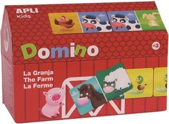 Al spelend leren met APLI Kids. Domino met 28 stukken. Gepresenteerd in een kartonnen huisje. Thema: boerderij.