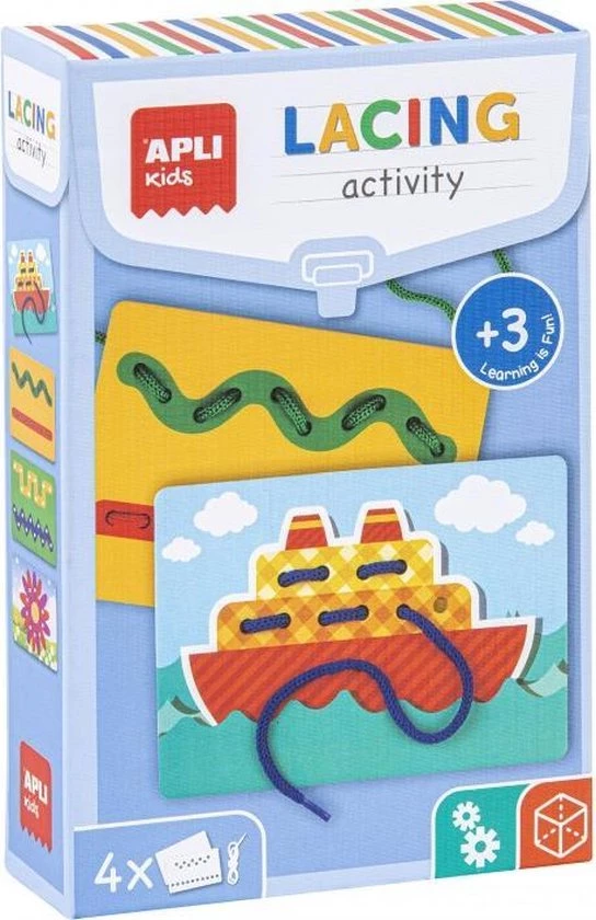 Spel om te leren rijgen en strikken. Elk spel bevat 4 rechthoekige kaarten met illustraties (boot, bloem en verschillende lijnen) van 177 x 127 mm en 4 veters van verschillende kleuren.