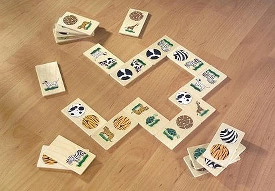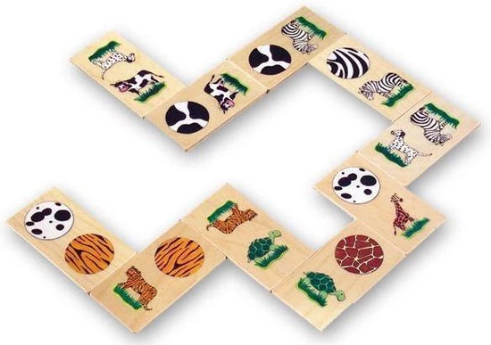 Een leuk en leerzaam domino spel. Een paar dieren vallen door de tekening van hun vacht op. Dit dominospel vertoont echter niet alleen dieren, daarom opgelet, want zwartwitte-vlekken heeft niet alleen een koe.