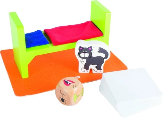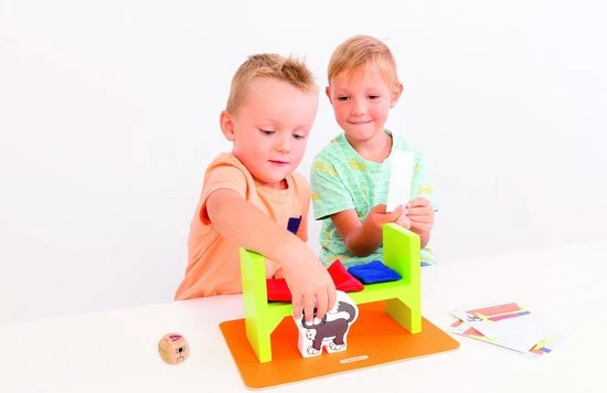 Monty de kat is steeds weer ergens anders. De ene speler neemt een kaart en legt aan de andere speler uit welke opstelling hij op de kaart ziet staan. De ander moet met de aanwijzingen de juiste opstelling maken. Ontwikkelt de communicatieve vaardigheden van kinderen, evenals de oog-handcoördinatie.