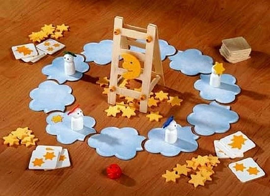 | Verpakkingsinhoud | Spel, sterrenkinderen, materiaal, hout:, 4, sterrenkinderen, 10, wolken, 1, ladder, met, maan, 30, sterretjes, 20, motiefkaarten, 1, dobbelsteen, met, 1-3, ogen. |