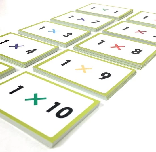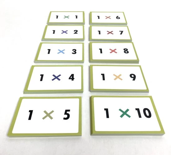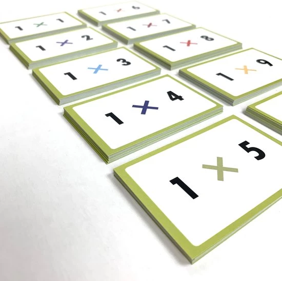 De tafelsomkaartjes zijn los van elkaar, maar ook als gehele set te bestellen. De achterkant van één set tafelsomkaartjes heeft hetzelfde gekleurde keerteken op de achterkant staan.