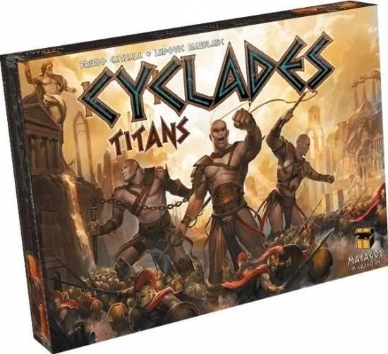 Cyclades Titans – Matagot The second expansion for Cyclades, includes a new game board with large islands on which ground attacks can be carried out as well as the Titans of Greek legend, who can conduct attacks without the help of Ares. With the help of the Gods, there are now 6 great cities of ancient Greece fighting for supremacy. The Titans expansion allows for up to 6 players, and offers 2 game modes: ? From 3 to 5: competitive game. ? Everyone for himself ? just like in the base game. The goal is still to have two Metropolises at the end of a cycle. ? With 4 or 6 players: team-play (with teams of two) :: Matagot