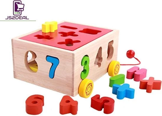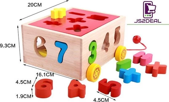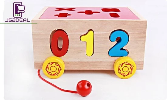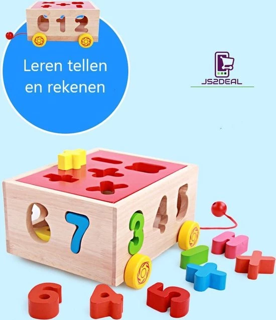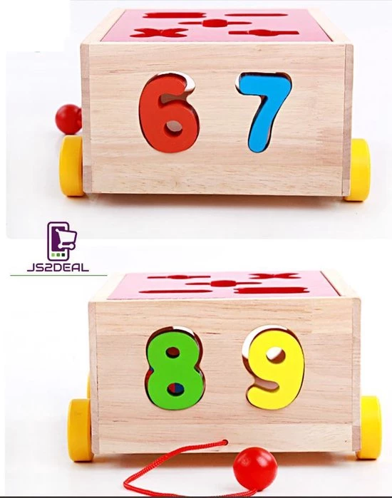Houten speelgoed trek kar met cijfers en reken symbolen