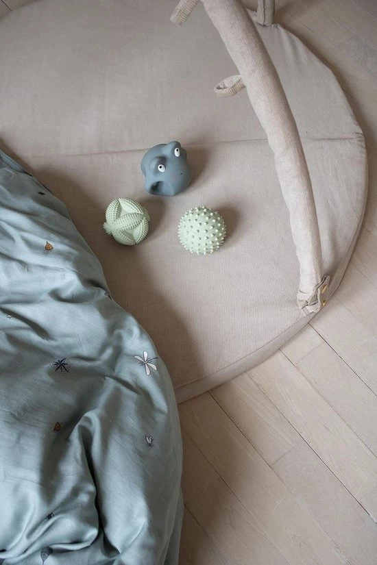 De motoriekballen zijn ontworpen voor de motorische ontwikkeling. Met het hart in al onze producten, hebben we een ballencollectie gecre?erd, met tactiele oppervlakken, goede eigenschappen en in fijne kleurschakeringen.De motor skills ballen zijn geproduceerd in 100% natuurlijk rubber en helpen de motoriek en grijpreflexen van het kind te stimuleren. Met een leuk zacht belletje binnenin, stimuleert het ook de gehoorzintuigen van de baby. Op het oppervlak zijn kleine deukjes aangebracht die ideaal zijn voor kinderen met sensorische behoeften of kinderen die gewoon een beetje zachte aanraking nodig hebben, tegelijkertijd zijn alle randen zacht, wat kan helpen bij pijnlijk tandvlees en tegelijkertijd stimulerend is voor de tastzintuigen. Geweldig product voor de ontwikkeling van de fijne motoriek van het kind.Aangezien de bal geproduceerd is in 100% natuurlijk rubber, kan de uitdrukking lichtjes vari?ren van zacht tot zacht.