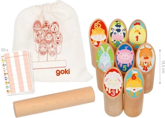 Schaakspel: KUBB NUMMERS/DIEREN H14,5xdiam.4,5cm, 8-delig, hout, in katoenen zakje, 4+