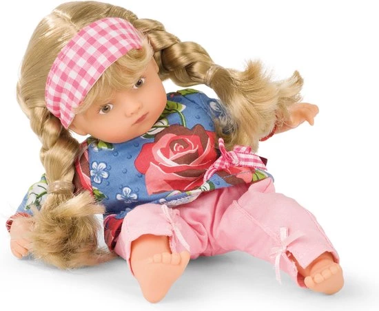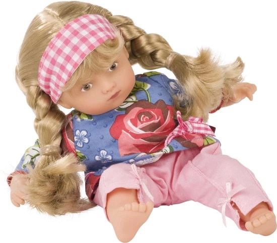Klein lief mini popje van G?tz. Deze lieve meid heeft 2 blonde vlechtjes met een geblokte haarband in.