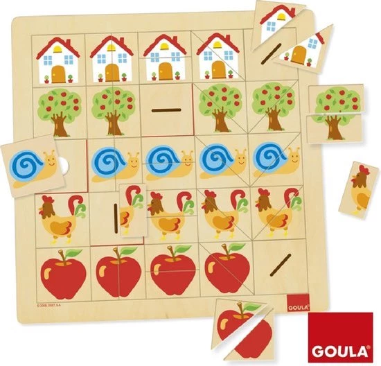 Zoek de juiste helften bij elkaar! Mooie houten puzzel van Goula.