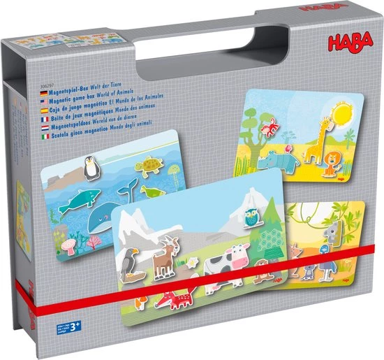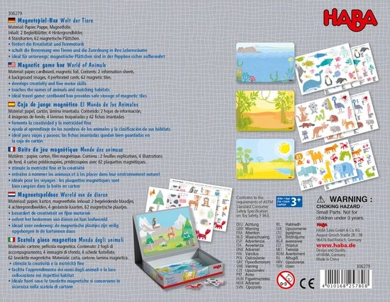 Deze magneetspeldoos bevat talrijke magnetische plaatjes om de boeiende leefwerelden van verschillende dieren weer te geven. Wie leeft er in de savanne? En wie in de jungle? Vind je pingu?ns op de bergtop of aan de kust? Hoog tijd om dat uit te zoeken! De binnenkant van het deksel is een bedrukte metalen folie. De kinderen kunnen zowel direct op dit schuine vlak als op de achtergrondbeelden puzzelen.