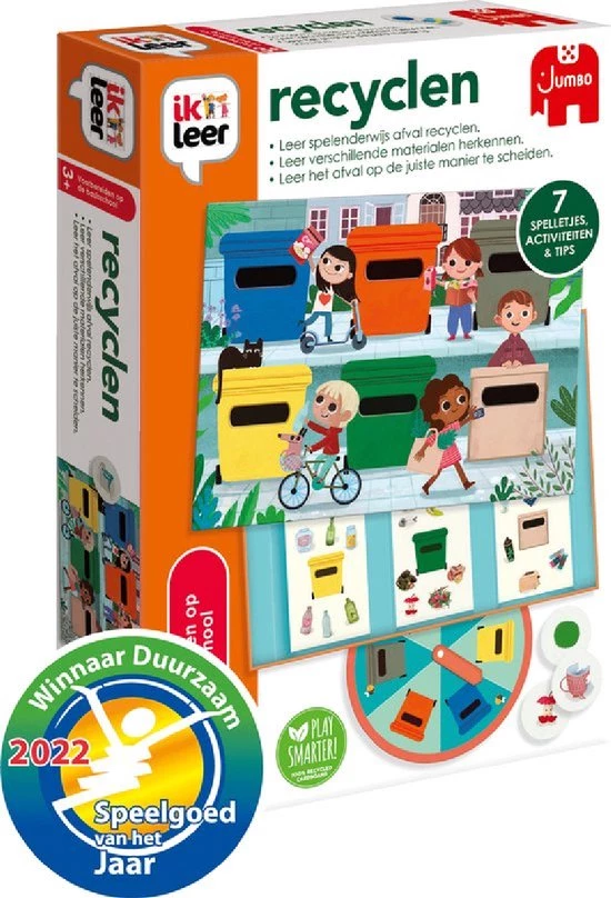 Ik Leer Recyclen van Jumbo leert kinderen spelenderwijs hoe zij het beste afval kunnen scheiden om te recyclen. Met behulp van de 7 spelletjes, activiteiten en tips ontdekken kinderen welk materiaal in welke bak thuishoort. Zo maken we samen de wereld een stukje schoner en mooier! Ik Leer Recyclen is geschikt voor kinderen vanaf 3 jaar en bevat spelletjes die samen of alleen gespeeld kunnen worden. Dit educatieve spel is zelfcorrigerend; Op de achterkant van elk fiche staat de kleur van de bak waar dit in moet. Zo kunnen kinderen ook zelfstandig aan de slag met het thema recyclen.