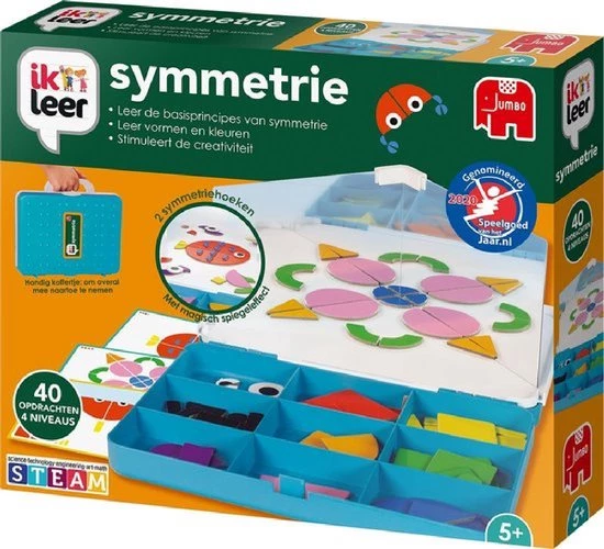Ik Leer Symmetrie is een verfrissend leuk constructiespel, waarbij visueel-ruimtelijke vaardigheden en logisch denken vereist zijn. Door gebruik te maken van ????n spiegel of twee spiegels, die onder een hoek van 90 graden worden geplaatst, kunnen kinderen symmetrische plaatjes maken door gekleurde vormpjes op het podium voor de spiegel(s) te leggen. In de spiegel(s) wordt dan het totaalplaatje zichtbaar, wat voor de kinderen een leuke verrassing zal zijn. Goed voor het ruimtelijk denken en het bevorderen van creativiteit. Ook esthetisch leuk. Er kan op verschillende niveaus gespeeld worden en eventueel ook met zijn twee??n.