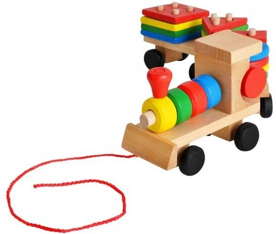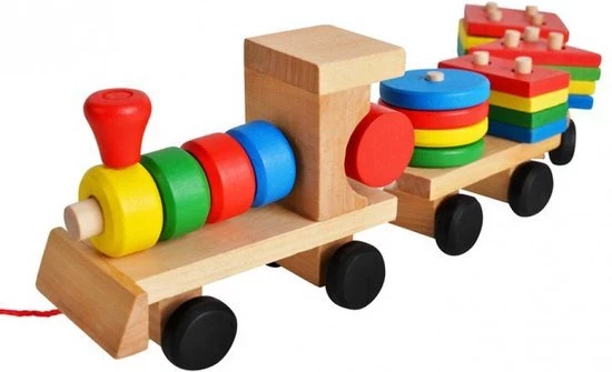 Een kleurrijke houten rij bestaande uit vele delen voor zelfassemblage trekt de aandacht van het kind en moedigt spelen aan. De set bestaat uit een locomotief met 2 pennen en gekleurde ringen en twee wagons (met pennen) op wielen, die ook een sorteerder van blokken van verschillende kleuren en geometrische figuren zijn.