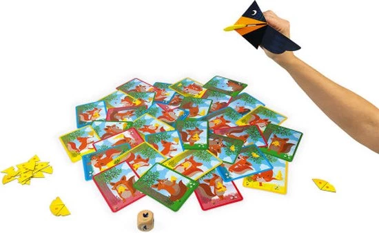 Ma?tre Corbeau, op een hooggelegen boom, hield een kaas in zijn bek … We veranderen de klassiekers niet, zelfs vandaag worden vossen nog steeds aangetrokken door de geur van kaas! Hier is het uitgangspunt van dit volledig originele spel voor kinderen vanaf 4 jaar. Het principe ? Elke deelnemer speelt om de beurt de kraai door zijn hand in het poppetje te steken en de kaas stevig in zijn bek te houden terwijl hij zijn ogen gesloten houdt. Elke speler kiest een kleur voskaart voordat ze allemaal open op tafel worden gelegd. De dobbelstenen vertellen de kraai hoe hij moet vliegen, omhoog, omlaag, zigzag? Wanneer een van de spelers stop roept, moet de kraai zijn kaas op de kaarten laten vallen. Elke speler wiens kleur is aangeraakt, wint een deel. Wie is de snelste om zijn kaas aan te vullen en de kraai te bedriegen? Dit spel bevat 1 kraaipop, 1 stoffen kaas, 32 vossenkaarten, 24 stukjes kaas en 1 dobbelsteen. De kaarten en de kraai zijn van papier, de dobbelsteen van massief hout, de kaas van stof en de kaastellers van karton. Dit spel is FSC-gecertificeerd (hout uit duurzaam beheerde bossen).