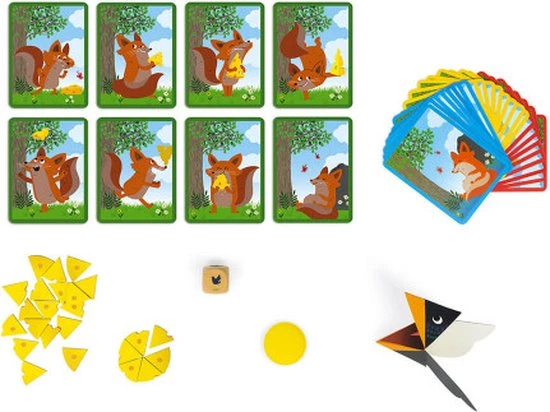 | Verpakkingsinhoud | Dit, spel, bevat, 1, kraaipop, 1, stoffen, kaas, 32, vossenkaarten, 24, stukjes, kaas, en, 1, dobbelsteen. |