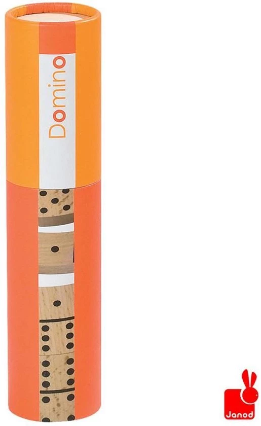 Dominostenen in een koker. Afm. 5 cm doorsnede, 22 cm hoog