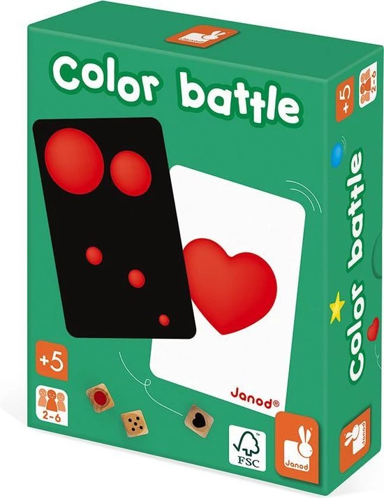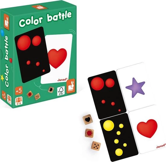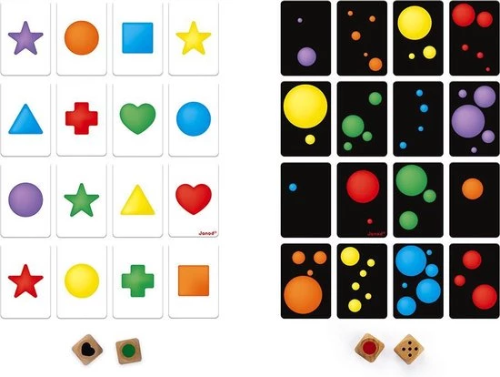 Gooi met de dobbelstenen en vind als eerste de kaart die door de 2 dobbelstenen wordt aangegeven! Met 2 moeilijkheidsgraden: eenvoudig met vormen en kleuren, expert met aantal stippen en kleuren. De speler die als eerste 7 kaarten in zijn bezit heeft is de winnaar van het spel. Dit spel ontwikkelt het observatievermogen en de snelheid. 36 kaarten + 3 dobbelstenen (stippen, vormen, kleuren). 2 tot 6 spelers. Kaarten : 7 x 10,5 cm.