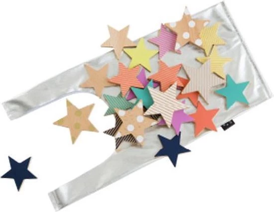 Inhoud – 25 sterren (5x grote sterren in wit en goud en 20x middelgrote sterren in de kleuren groen, roze, geel, marine en oranje) met een zilveren opbergtas.