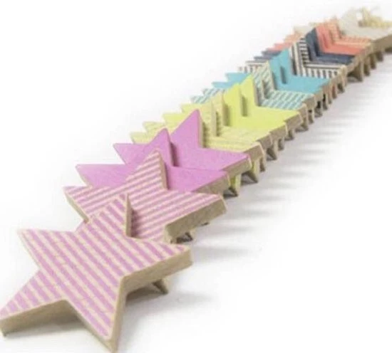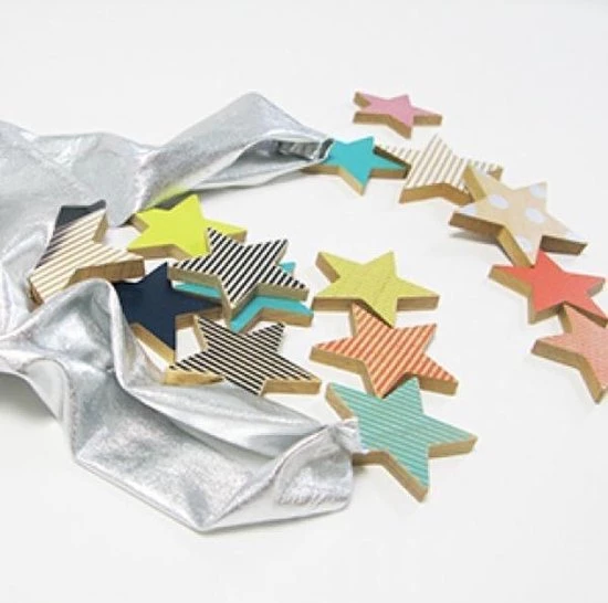 Het staat in de sterren geschreven! Een set van 25 prachtige houten sterren, om te gebruiken als doe-het-zelf-koekjes, in een rij als dominostenen, op elkaar stapelen of gewoon als decoratie. Zachte pasteltinten en een veilige hippe afwerking op deze grotere versie van de populaire sterrendomino’s van Kiko +. Ze zijn gemakkelijk voor kleine handen om stevig vast te pakken en ze zien er heerlijk lekker uit! Wanneer open jij jouw koekjeswinkel?: