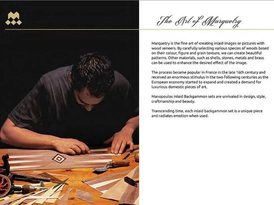 Deze backgammon set is handgemaakt met behulp van de kunst van inlegwerk, de kunst en het ambacht van het aanbrengen van stukken fineer in structuur om decoratieve patronen te vormen en ontwerpen.