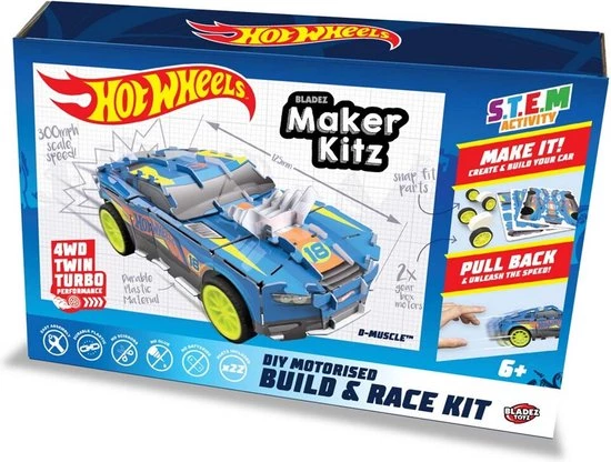 Bouw je eigen Hot Wheels auto met deze Hot Wheels Bladez Maker Kitz Build and Race Kit! Pop de plastic onderdelen uit het frame en zet de auto zonder lijm in elkaar. Zodra je klaar bent, kan je spelen met de robuuste auto! Hij heeft een dubbele pullback motor voor geweldig snel raceplezier.