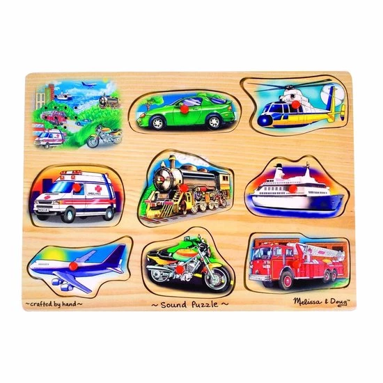 Melissa & Doug Classic Vehicles, Geluidpuzzel auto klassiek, leg de puzzelstukje terug op de juiste plaats en wordt beloont met het geluid van de voertuig. 9 stukjes voor kleine handjes.