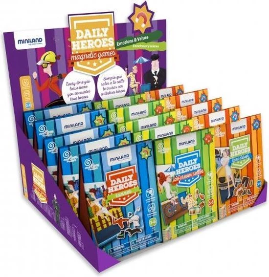 Minland Daily Heroes Dit leerspel geeft kinderen de mogelijkheid om op een leuke leerzame manier bezigheden te rangschikken en vormen te herkennen. Plaats de magnetische onderdelen op de juiste plek en cre??er jouw eigen wereld. Miniland leert jou rangschikken! Specificaties: Kleur verpakking: oranje Kleur leervel: multicolor Materiaal: karton Geslacht: junior Leerthema: vormen, kleuren Afmetingen: 15 x 10 x 5 cm (LxBxD) Leeftijd: 3-6 jaar Inhoud: 3 Leervellen