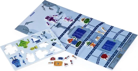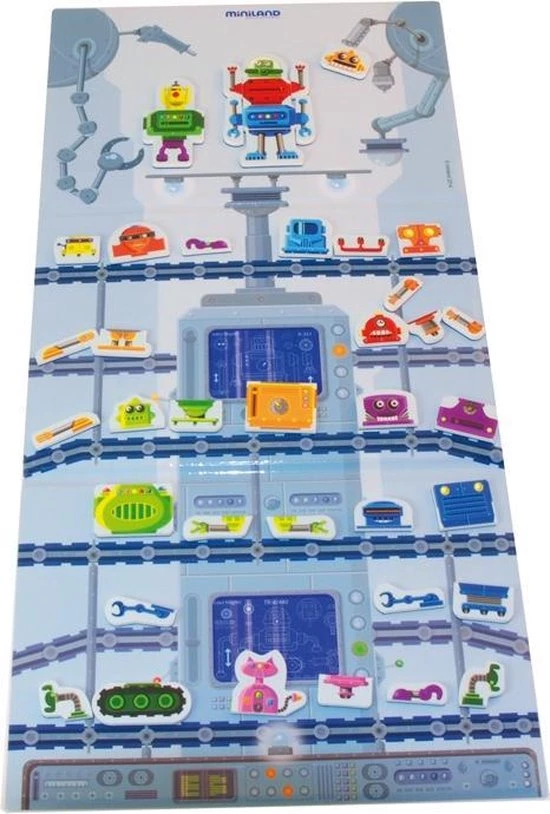 Dit leerspel geeft kinderen de mogelijkheid om op een leuke leerzame manier bezigheden te rangschikken en vormen te herkennen. Plaats de magnetische onderdelen op de juiste plek en bouw jouw robot. Op de achterzijde van de kaart staat een afbeelding van de juiste vorm ter controle. Miniland leert jou rangschikken!