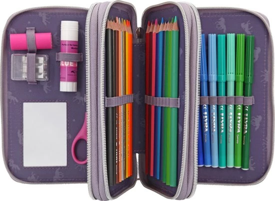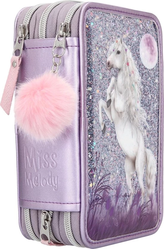 Deze etui is betoverend! Op de voorkant van de etui staat Miss Melody prachtig afgebeeld in een nachtelijke lucht vol glitter. De rest van de etui is uitgevoerd in zacht, glanzend paars. Aan de rits hangt een pluizige, roze pompon. De etui is gevuld met 18 viltstiften, 18 kleurpotloden, 2 potloden, een schaar, een puntenslijper, een liniaal, een lijmstift en een gum. Hiermee ben jij helemaal klaar voor school!