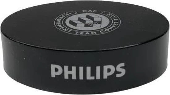 Een magnetisch zwart platform waar de acrobaten op kunnen staan, daar staat het merk Philips op en de tekst: DAP Improvement Team Competition, 15 acrobaten, 6 staven die de acrobaten vasthouden / op staan. De acrobaten en staven hebben een chrome / zilveren kleur. Afmetingen platform: (L) 10 x (B) 6 x (H) 2 cm , afmetingen acrobaten c.a. 2 cm.