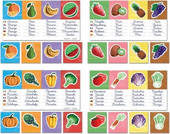 Quercetti Tag the Picture leerspel Met dit spel leer je om groenten en fruit te herkennen. Twee grote kleurrijke fruitkaarten en twee groentekaarten tonen afbeeldingen van groenten en fruit, samen met hun namen in 5 talen. Je moet de individuele kaarten matchen met de bijbehorende afbeelding op de grote kaart. Tijdens het spelen kan jouw kindje zijn fijne motoriek en hand-oog co??rdinatie verder ontwikkelen. Specificaties: Geslacht: junior Kleur: multicolor Materiaal: kunststof, karton Leeftijd: 3 tot 7 jaar Inhoud: 1 Link naar online gebruiksaanwijzing 2 Grote fruitkaarten 2 Grote groentekaarten 3 Bordjes 8 Fruitkaarten 8 Groentekaarten 56 Pinnetjes