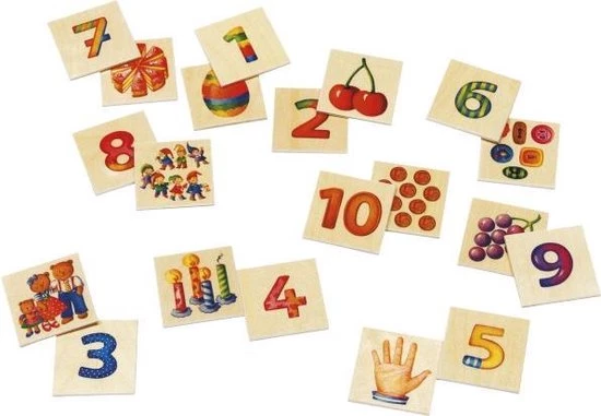 Urenlang speelplezier met memorie van Selecta, in het thema cijfer. Leg alle plankjes willekeurig neer met de cijfers en afbeeldingen naar beneden. Probeer het cijfer samen met de afbeelding die dezelfde hoeveelheid aangeeft te vinden. Verzamel zo snel mogelijk zo veel mogelijk cijfers en afbeeldingen die hetzelfde aantal aangeeft.