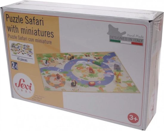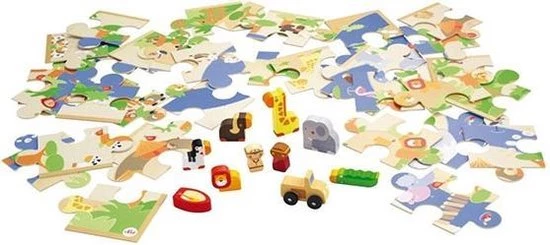 Een super vrolijke kinderpuzzel. De puzzel bestaat uit 32 stukjes en beeld de safari uit. Is de puzzel helemaal klaar dan kan erop gespeeld worden met de 10 meegeleverde speelfiguren.