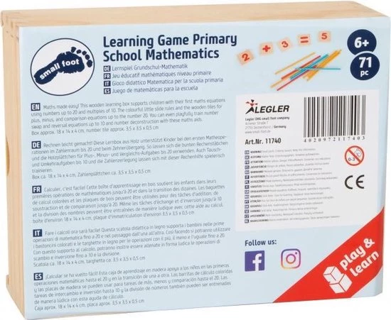 Dit rekenspel ondersteunt kinderen bij hun eerste berekeningen in het getallenbereik tot 10, en bij het overschrijden van de grens van tien. De kleurrijke rekenstokjes en de houten stukken kunnen gebruikt worden voor plus-, min- en vergelijkingstaken. Zelfs wissel- en omkeertaken en getalontbinding kunnen met dit rekenhulpmiddel spelenderwijs worden getraind. Ideaal voor kleuters en kinderen in het eerste jaar van de basisschool die beginnen met optellen en aftrekken. Alle cijfertegels en rekenlinialen kunnen veilig worden opgeborgen in de houten kist met schuifdeksel, zodat je het gemakkelijk onderweg kunt meenemen.