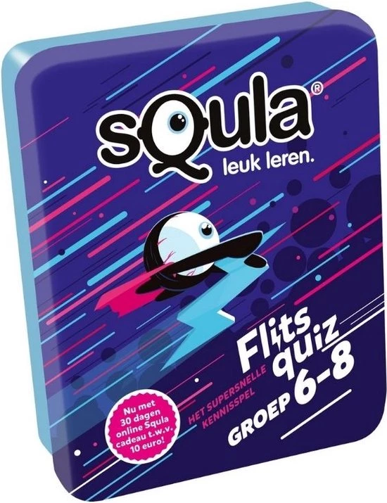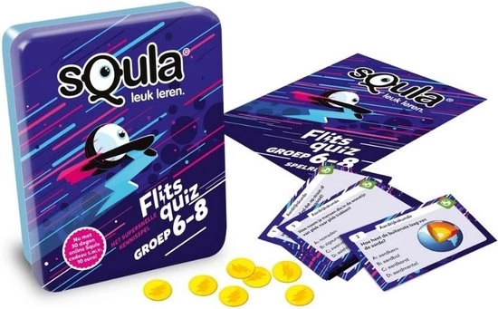 Flitsquiz voor groep 6 t/m 8! Test je kennis in dit flitsende kaartspel! Geef jij als snelste het juiste antwoord? Het spel bestaat uit meer dan 100 uitdagende vragen over verschillende basisschoolvakken. Draai een kaart open op tafel en bedenk het goede antwoord. Weet jij het juiste antwoord? Wees dan snel, voor je het weet is iemand je voor! Degene met de meeste punten wint. Soeel snel en slim. Klaar voor de start?… Flits! Veel speelplezier!
