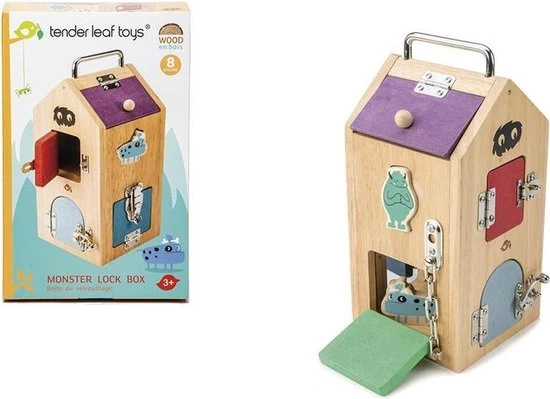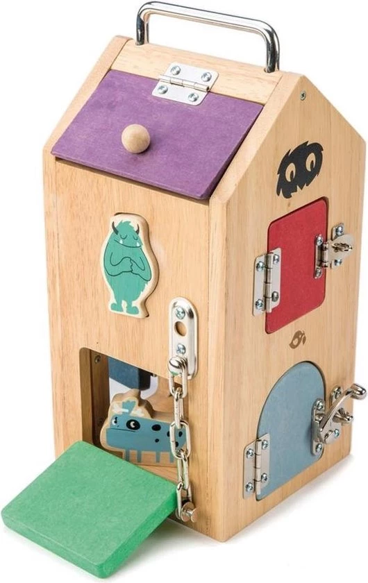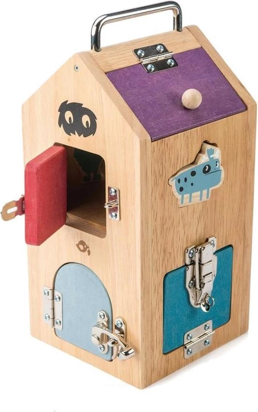 Deze mooie slotendoos heeft maar liefst acht verschillende deuren met verschillende slot variaties. Perfect om al je kleine monstertjes in te stoppen! De doos helpt kinderen met het ontwikkelen van hun exploratief vermogen en het oplossen van problemen door de verschillende sloten.