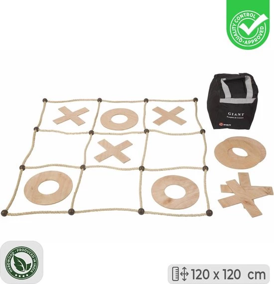 De speelstukken zijn van solide gepolijst hout, elk 30x30cm. Uiteraard 5 kruizen en 5 cirkels.