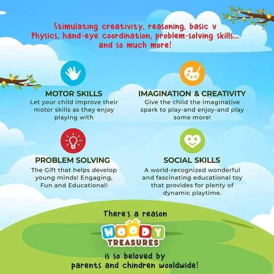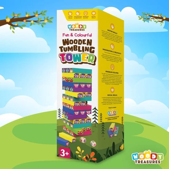 Het Woody Treasures 4-IN-1 tuimeltorenspel kan op 4 verschillende manieren worden gespeeld, zodat je kinderen zich niet zullen vervelen. Je kunt de toren bouwen en de dobbelstenen gooien om te weten welk blok je eruit moet halen, dominokettingen maken of gewoon je fantasie gebruiken om unieke ontwerpen te maken.